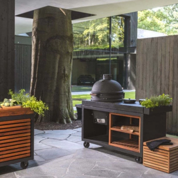 - Le kamado est sur un châssis, qui garantit que le kamado soit toujours stable et fermement en place.