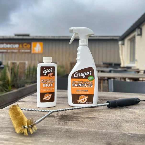 - Un nettoyant spécial barbecue : Ce nettoyant spécial barbecue a été spécialement formulé pour s’attaquer aux graisses cuites et recuites sur une grille, aux graisses anciennes qui se sont déposées dans le fond du barbecue et sur les parois de la cuve et éventuellement du capot.